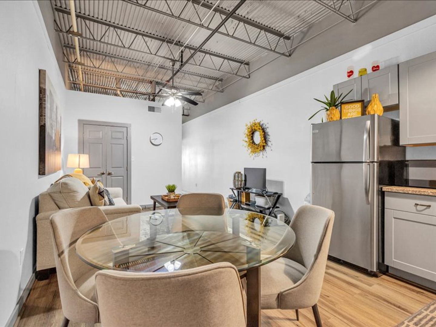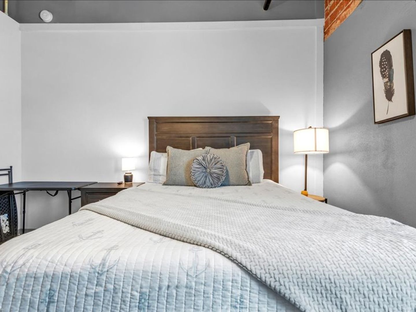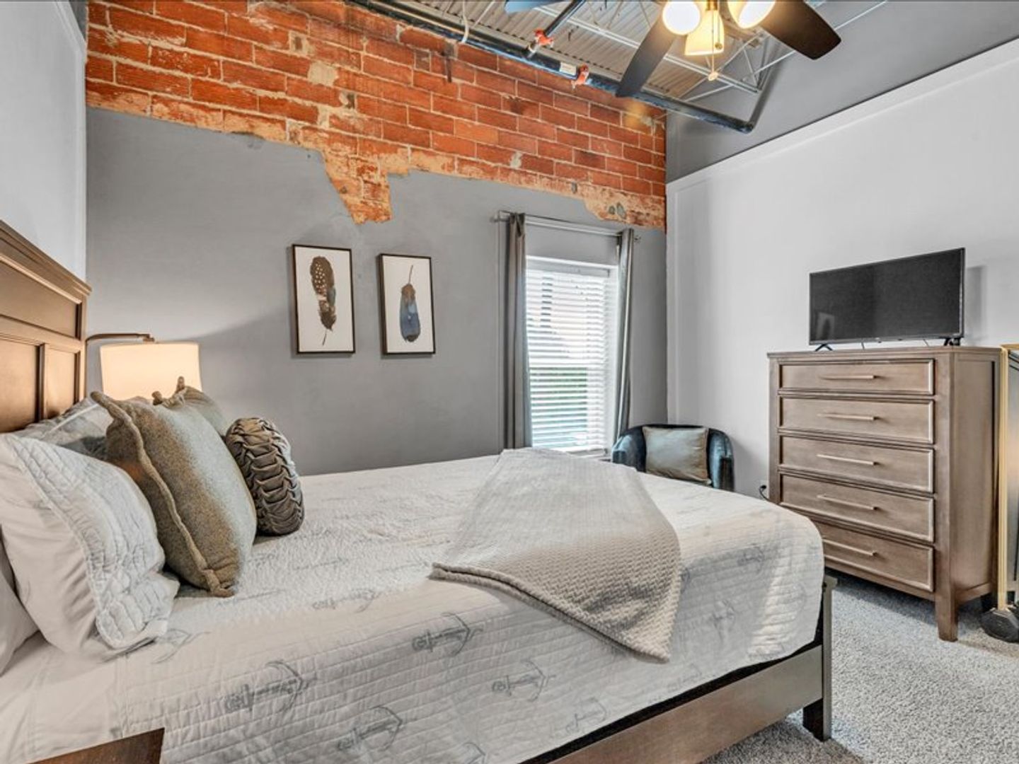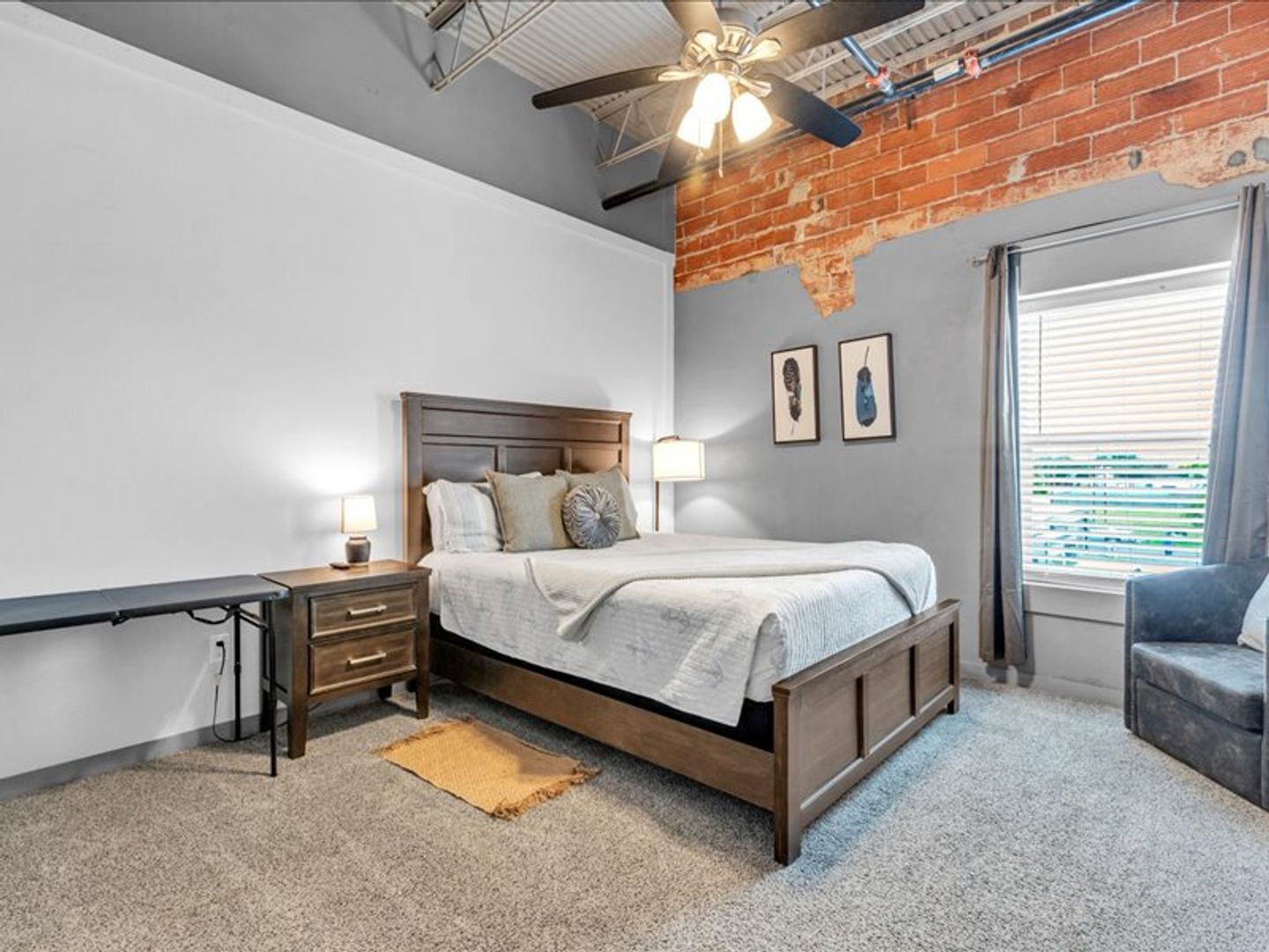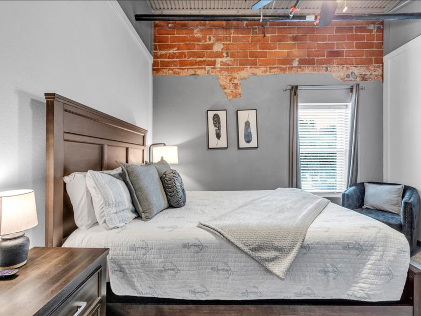 Fully furnished. Discover the allure of our recently renovated, beautiful modern lofts situated in Baytown. Boasting 12-foot exposed ceilings and brickwork, these residences exude a contemporary industrial aesthetic. Granite countertops, complemented by wood laminate flooring and soft grey walls create a sophisticated ambiance. The carpeted bedrooms provide a cozy retreat, while the convenience of assigned parking in the garage enhances your urban living experience. Ideally located just steps away from the vibrant arts district, these lofts offer a highly walkable lifestyle. Enjoy preferred discounts if you're a Lee College student, with the campus conveniently across the street. Welcome to a harmonious blend of style and convenience. Call today for a showing!