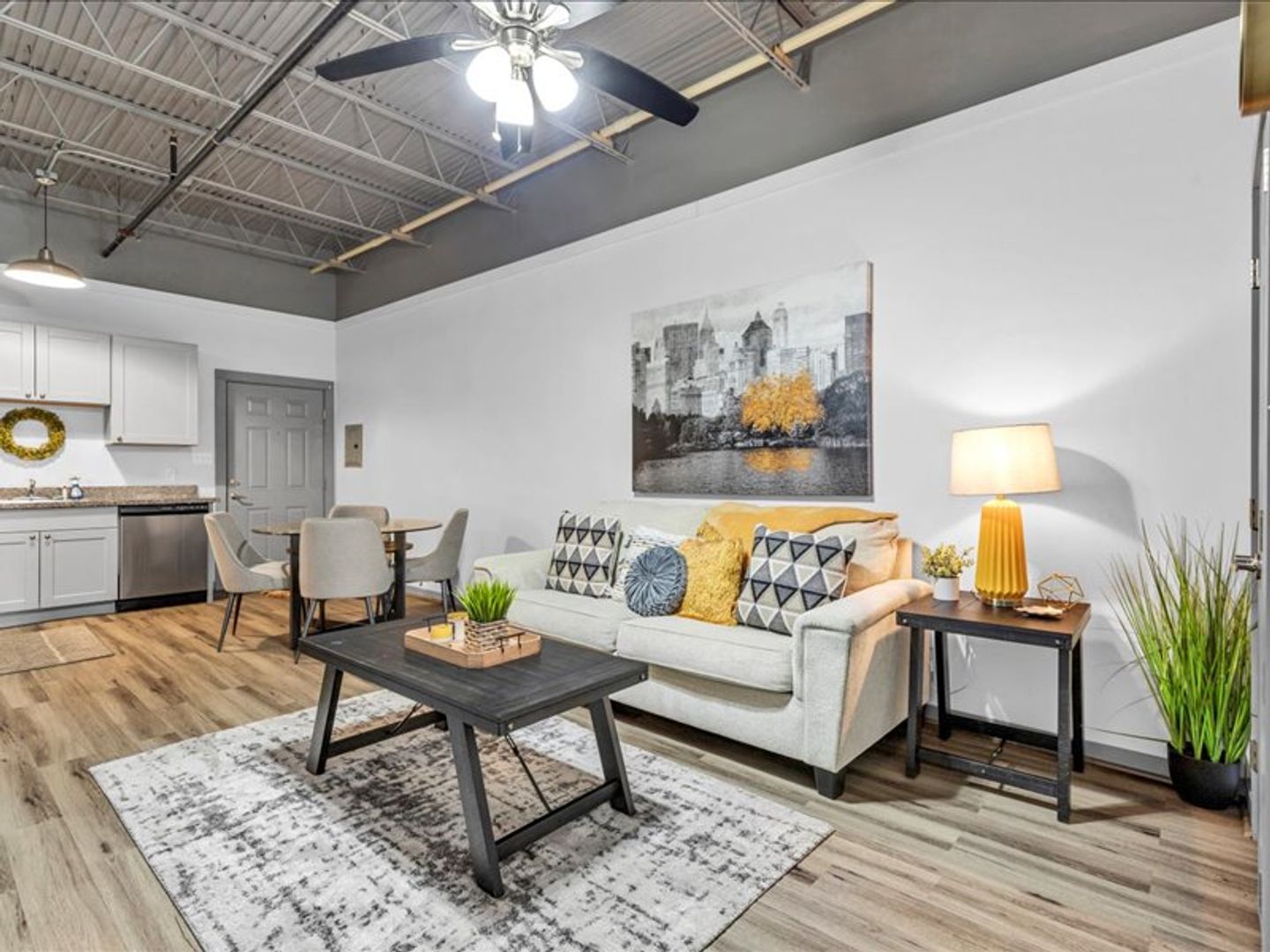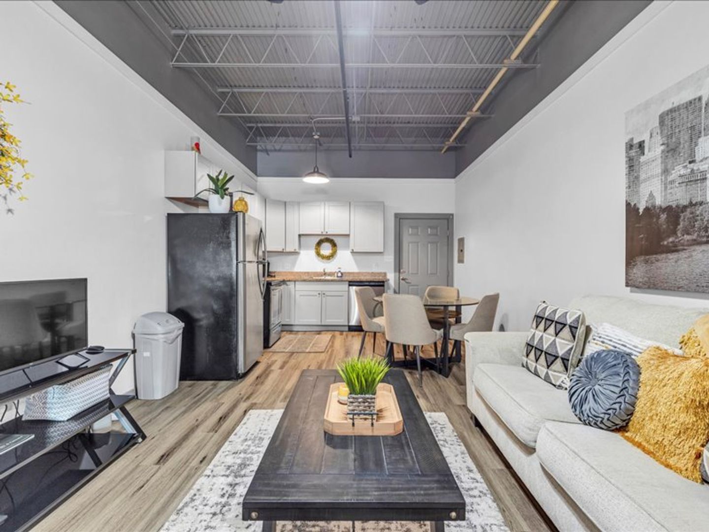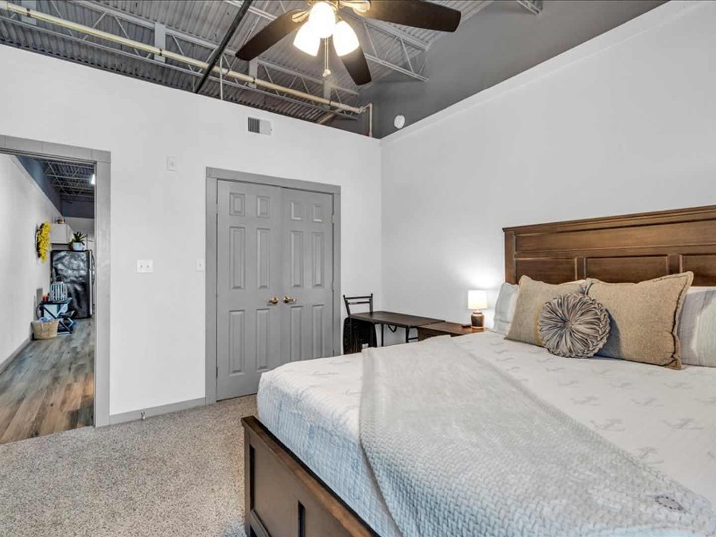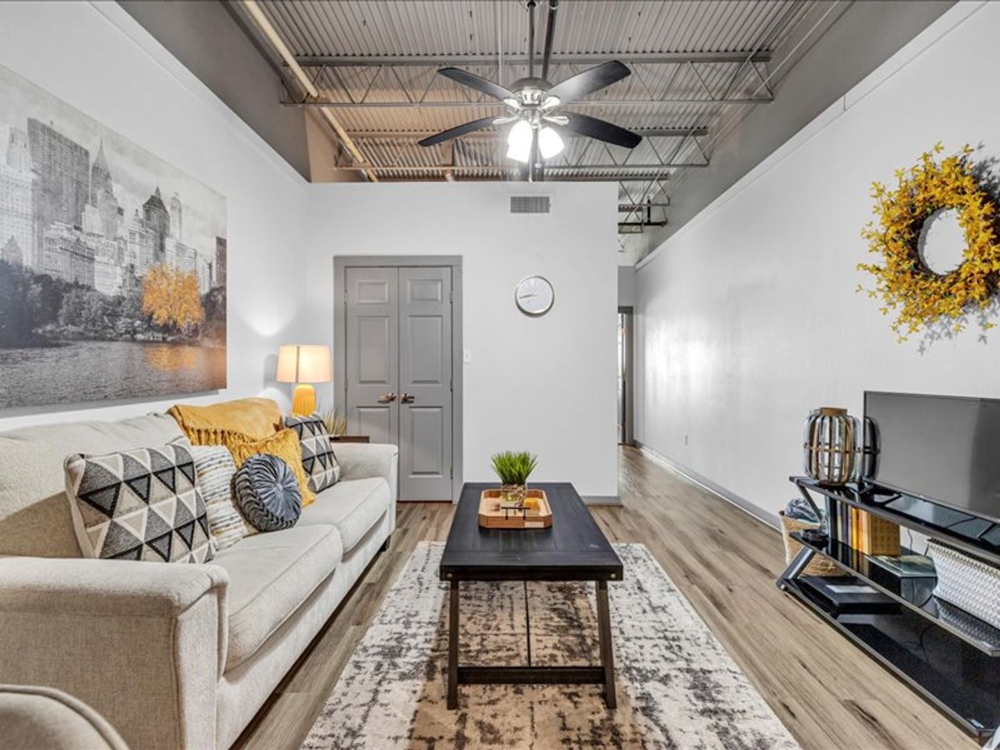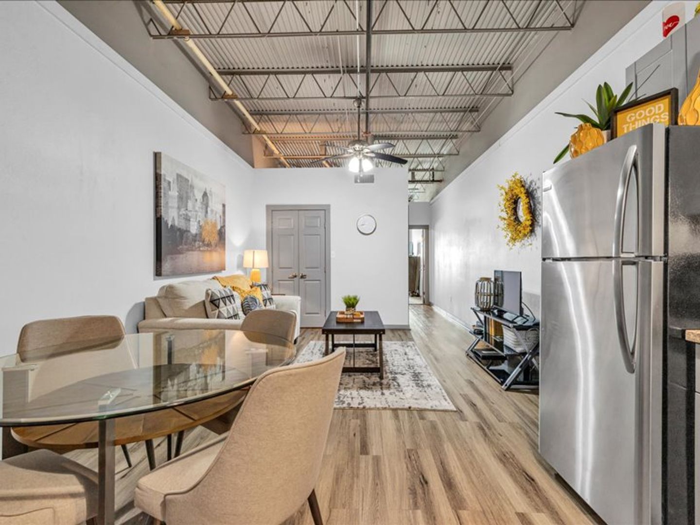 Fully furnished. Discover the allure of our recently renovated, beautiful modern lofts situated in Baytown. Boasting 12-foot exposed ceilings and brickwork, these residences exude a contemporary industrial aesthetic. Granite countertops, complemented by wood laminate flooring and soft grey walls create a sophisticated ambiance. The carpeted bedrooms provide a cozy retreat, while the convenience of assigned parking in the garage enhances your urban living experience. Ideally located just steps away from the vibrant arts district, these lofts offer a highly walkable lifestyle. Enjoy preferred discounts if you're a Lee College student, with the campus conveniently across the street. Welcome to a harmonious blend of style and convenience. Call today for a showing!