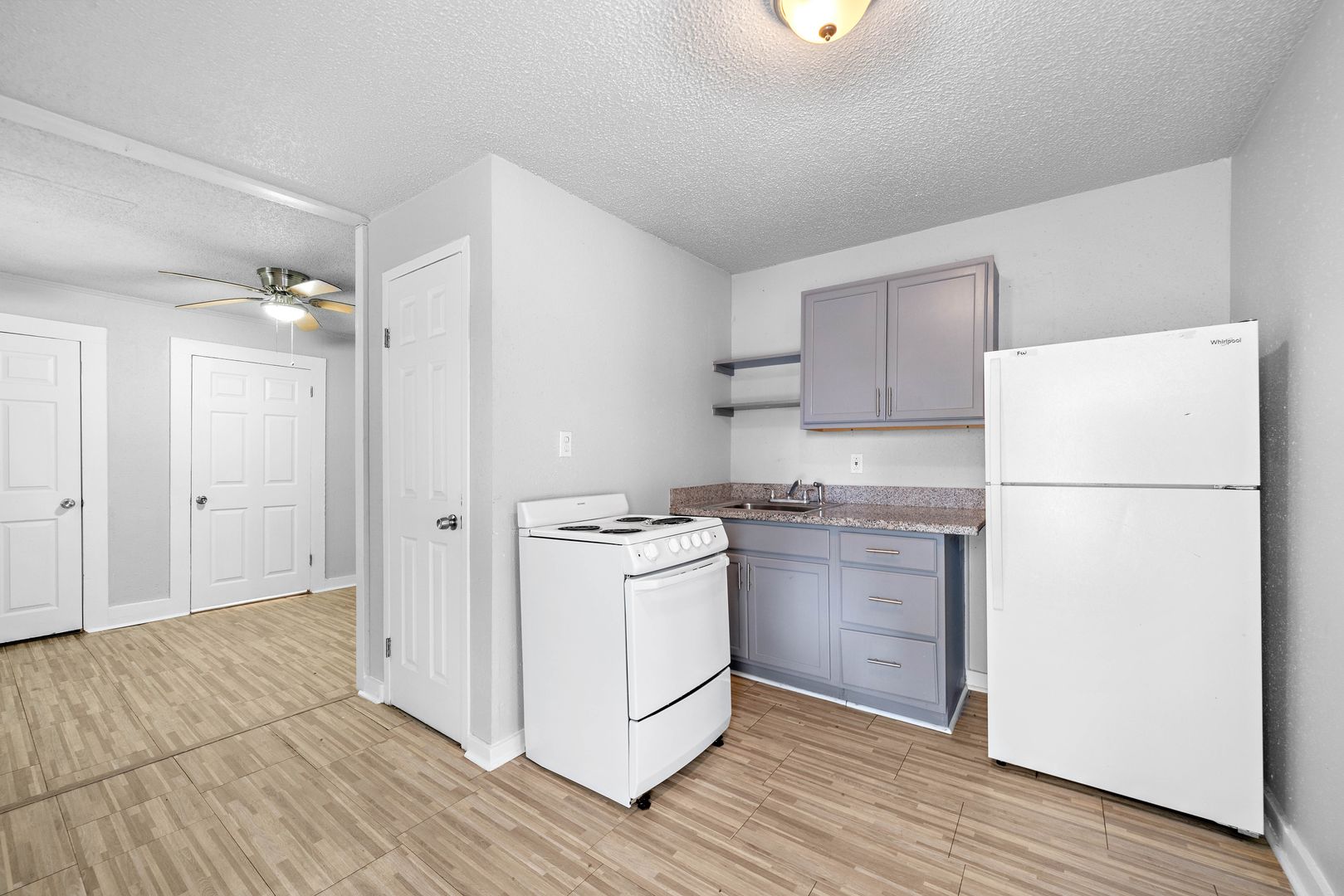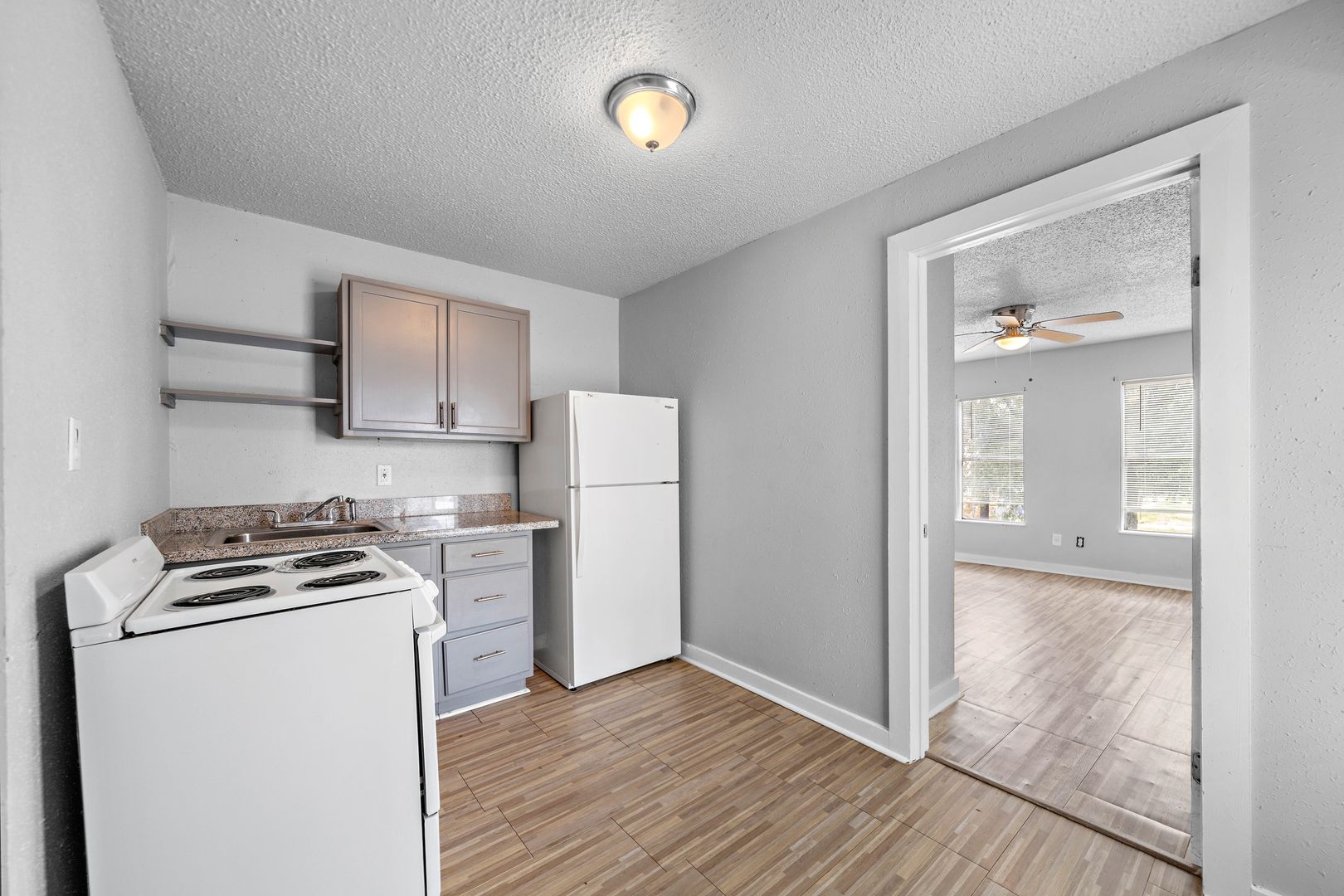 Cute, Cute, Cute!! One Bedroom One Bath Apartment Home with Fresh Paint Throughout in Neutral Tones that will go with any decor! Faux Wood Vinyl Plank Floors Throughout!! Pretty, European Style, Neutral cabinets with Marble Countertops in the Kitchen! Comes with Refrigerator and Stove/Oven!! Ceiling Fans in Living area and Bedroom! Hollywood Style Lighting in Bathroom and Medicine Cabinet with Storage and Mirror! Come Lease it before it's gone!! It won't last long!! Section 8 WELCOME!!! All measurements are approximate and should be verified.